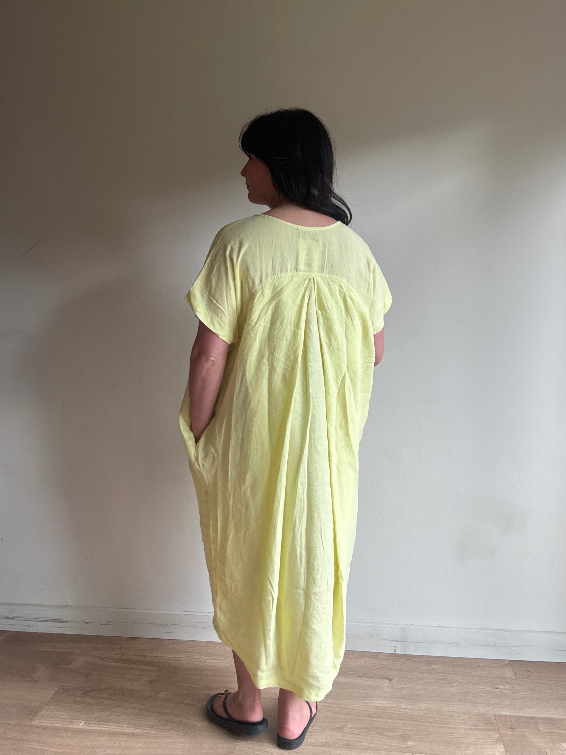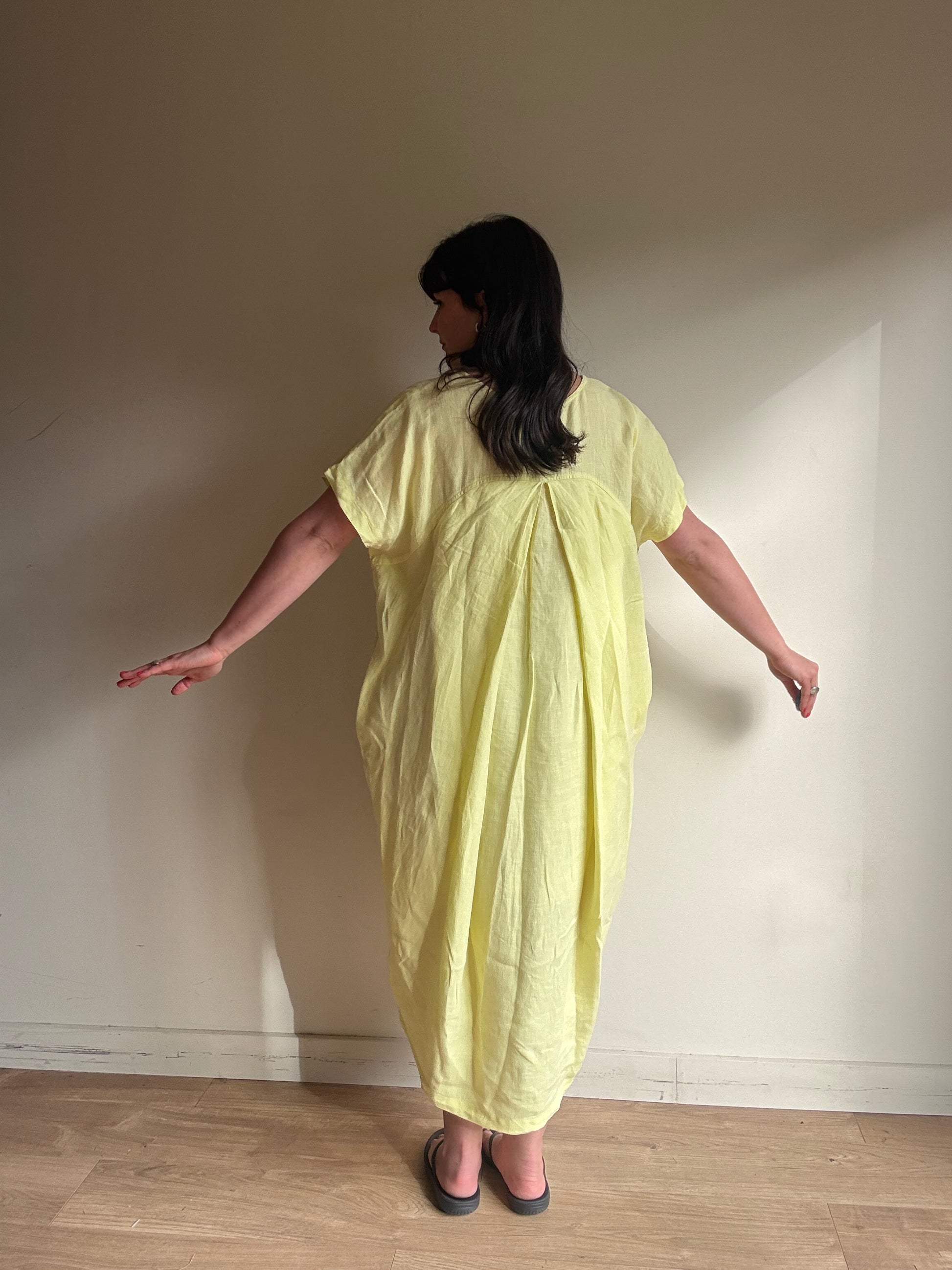 Classic shape with the pleat down the back. The iconic bud dress by Black Crane.