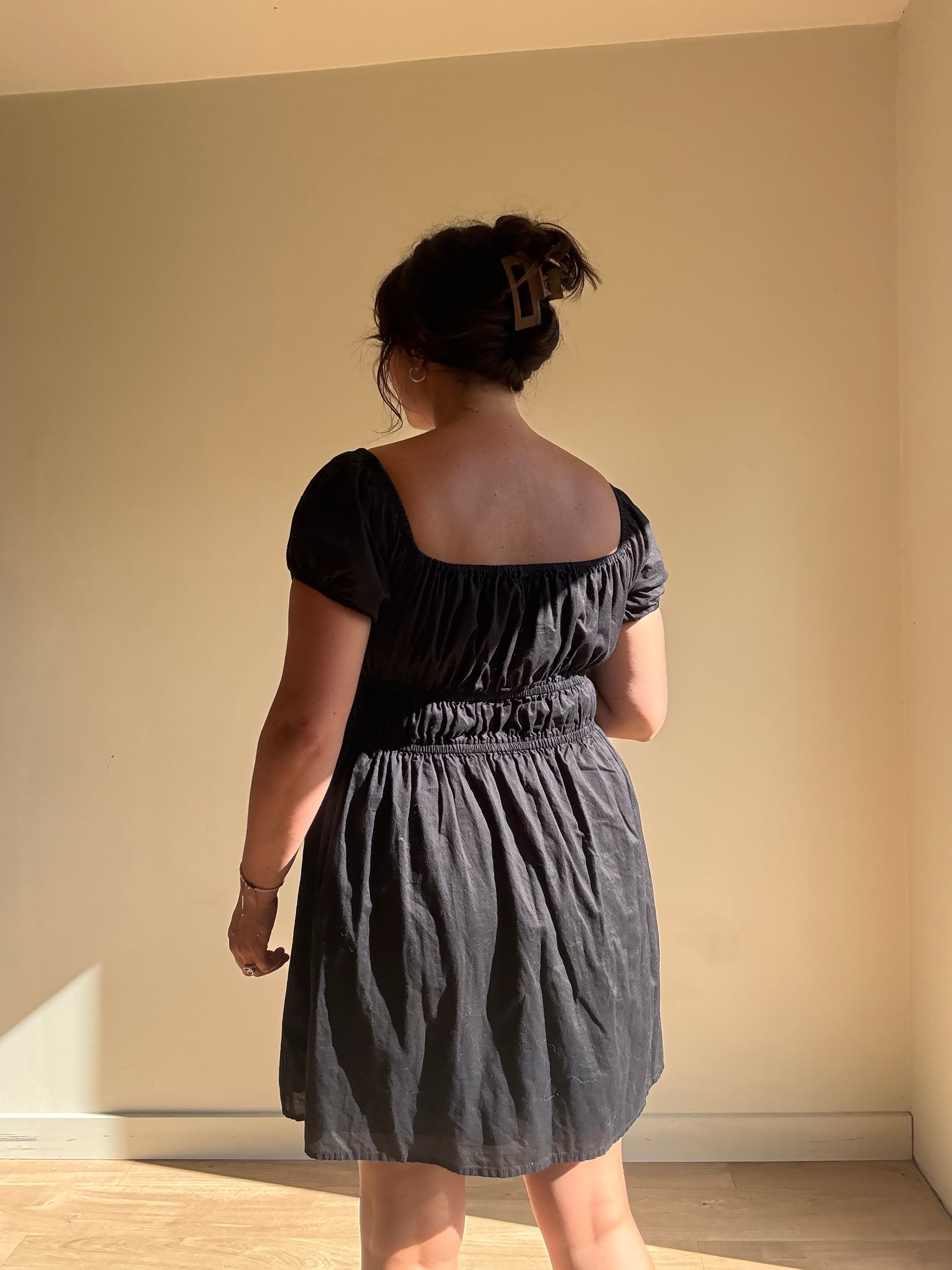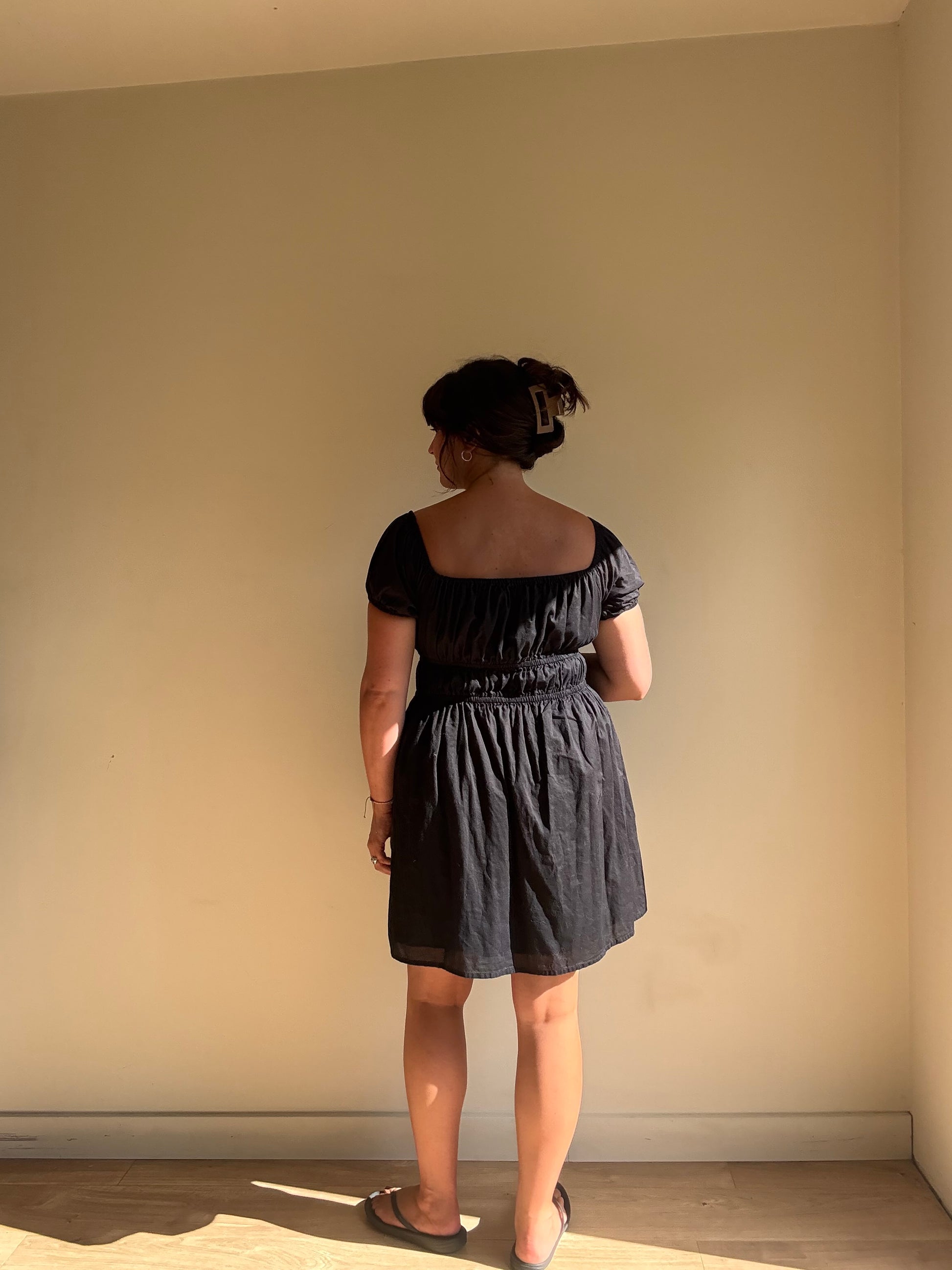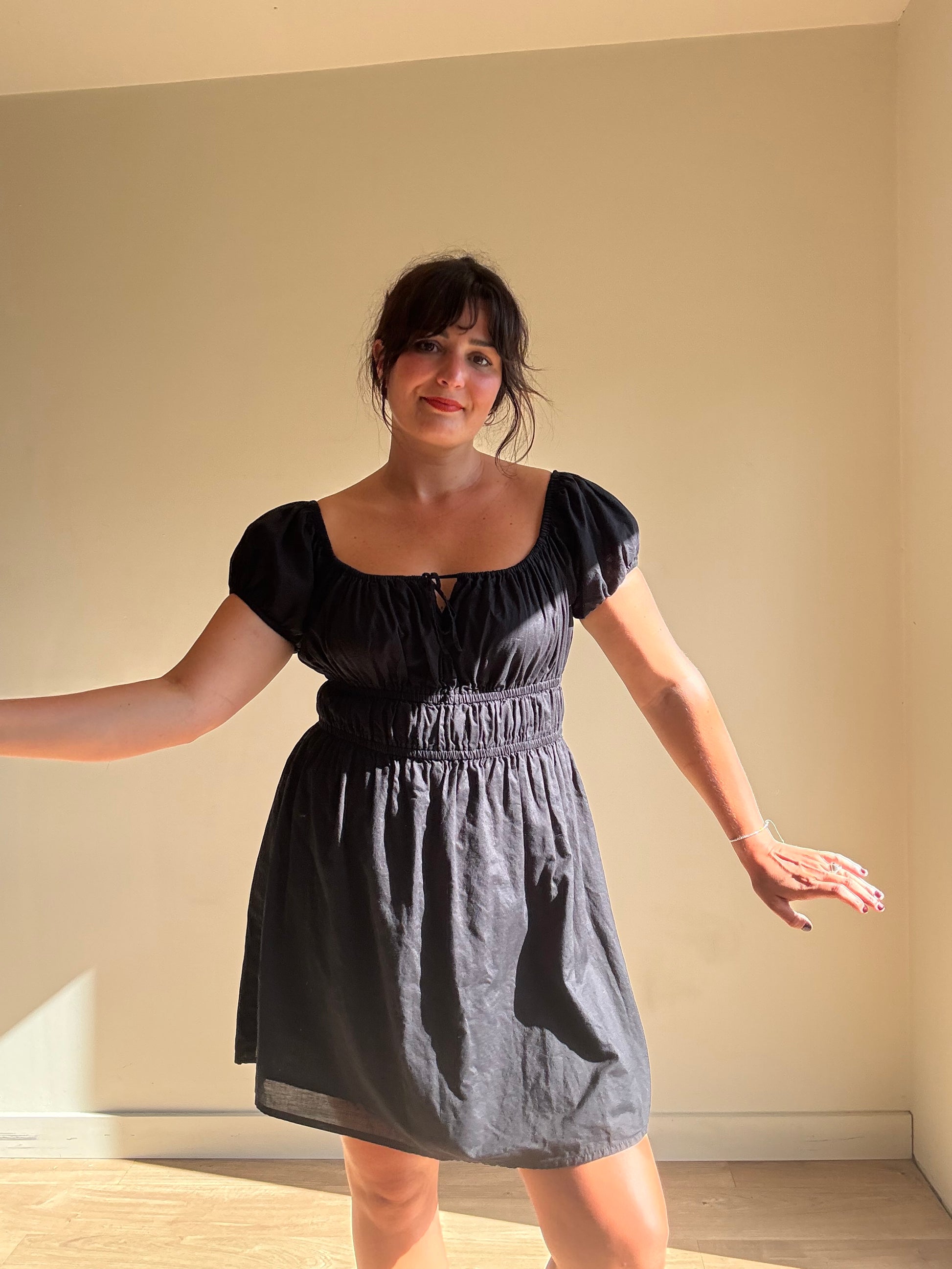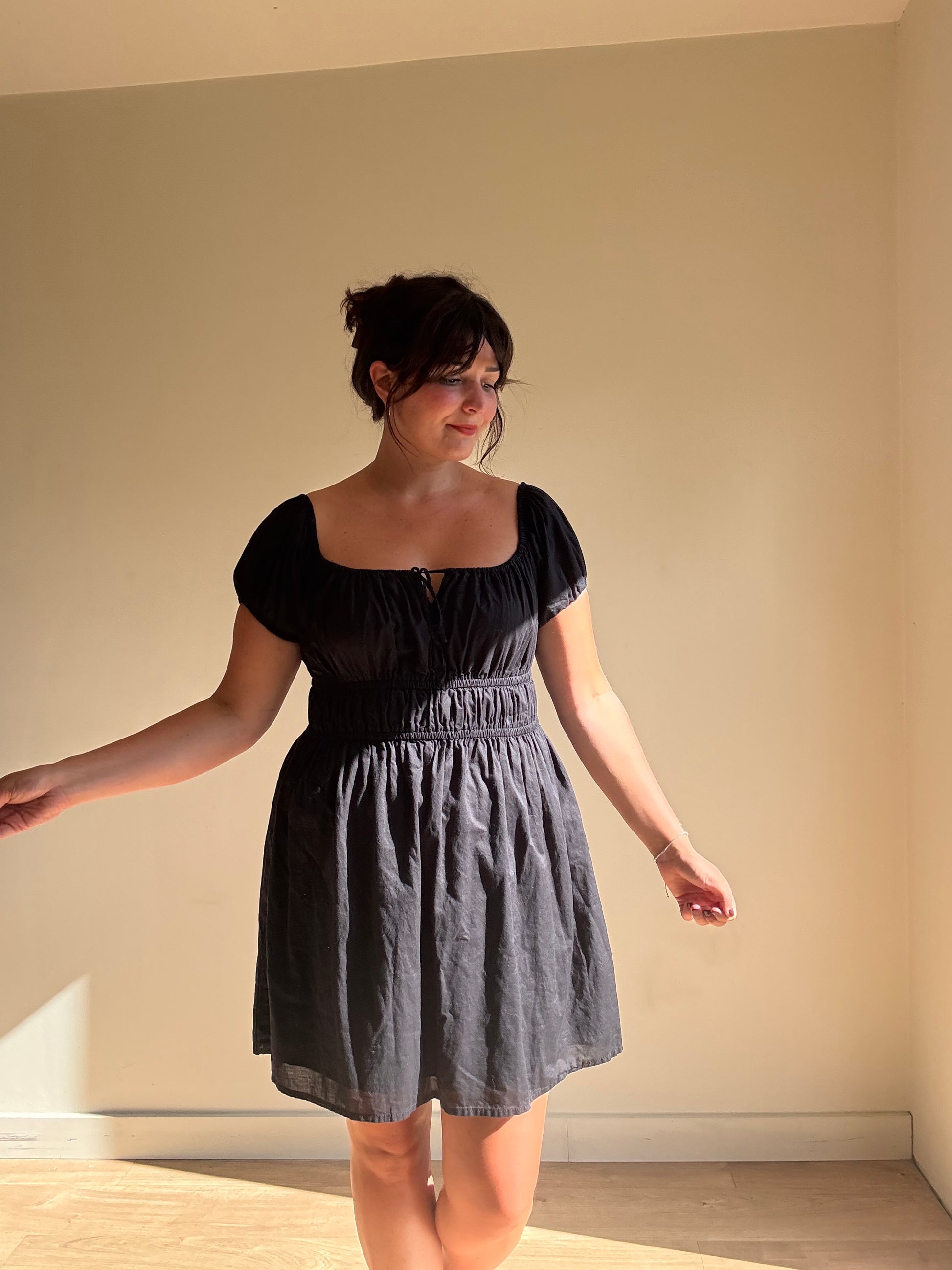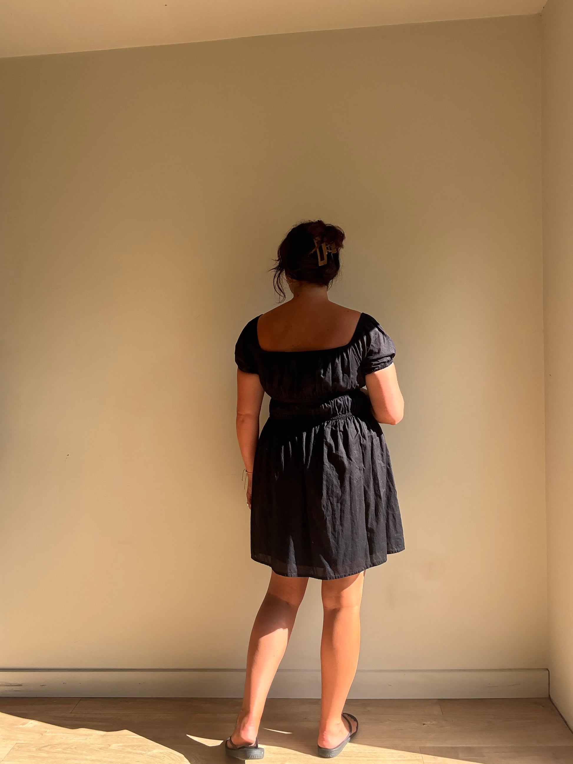A signature FAITHFULL silhouette, reimagined with new elevated details and designed from 100% cotton in a classic black colourway. It is a sweet, feminine mini dress with a scooped neckline and back along with oversized puff sleeves, elasticated at the cuff. It is gathered at the bust with three tiers of stitching and a bow tie detail, also elasticated for stretch. From the waist it falls into a soft A-line skirt. Style with a ballet flat for elevated everyday wear.