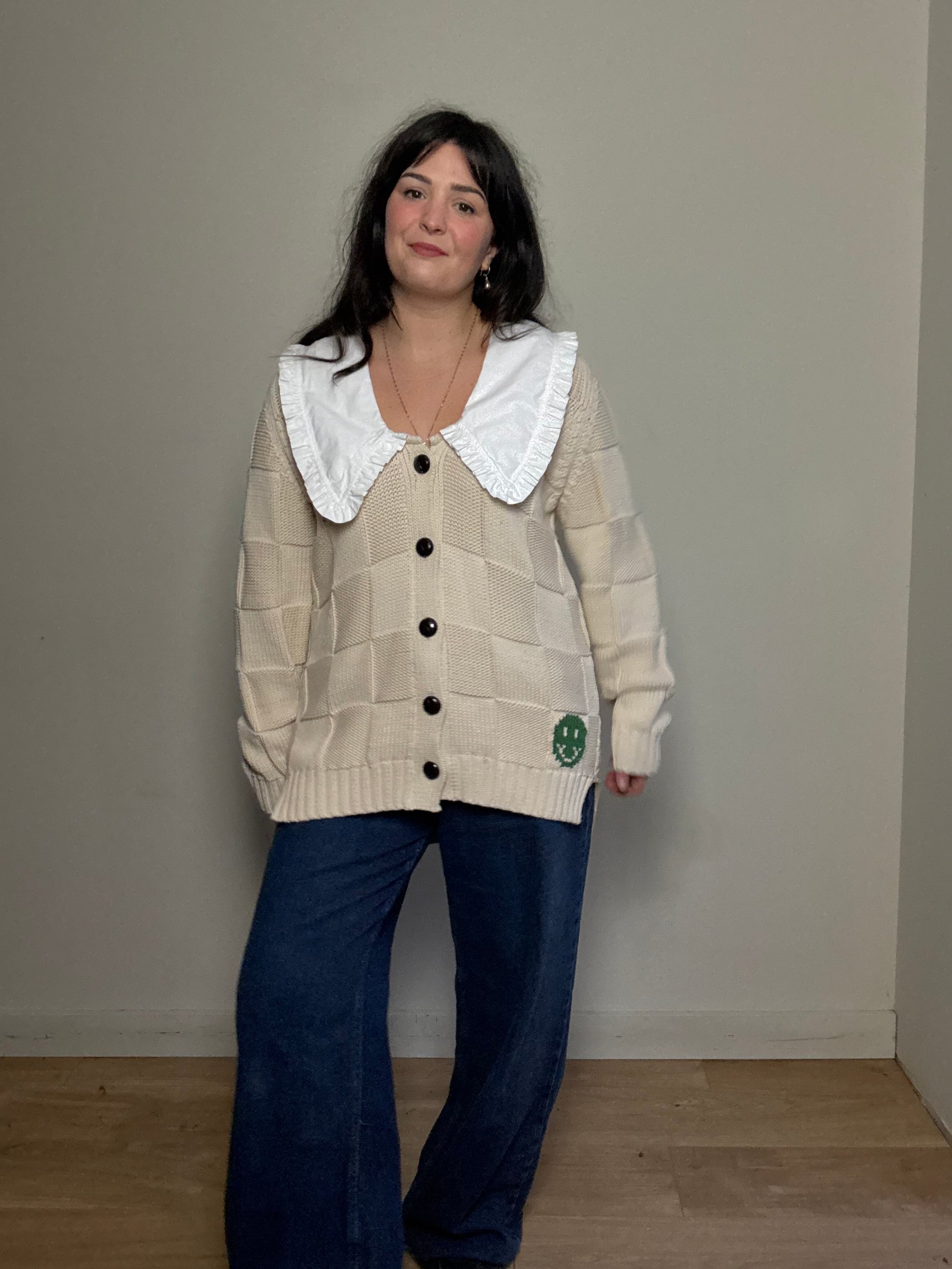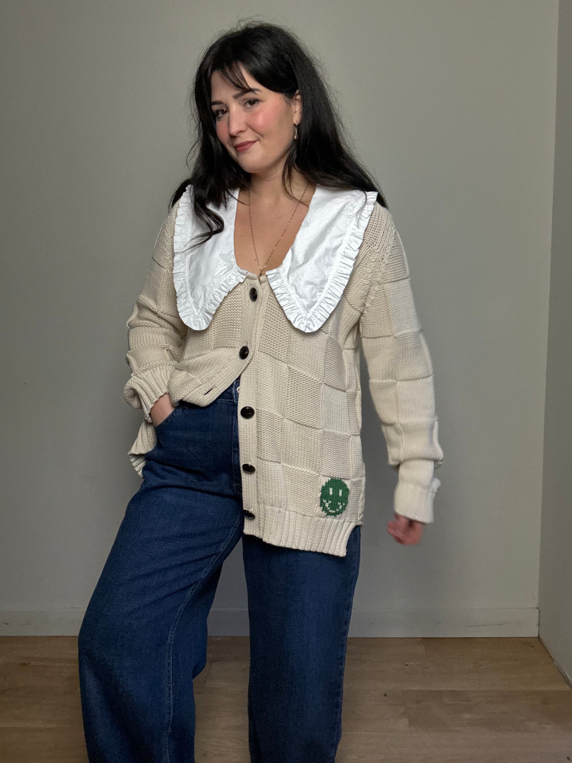 Boxy cardigan in chunky knit, featuring a signature GANNI cotton poplin collar and smiley face.