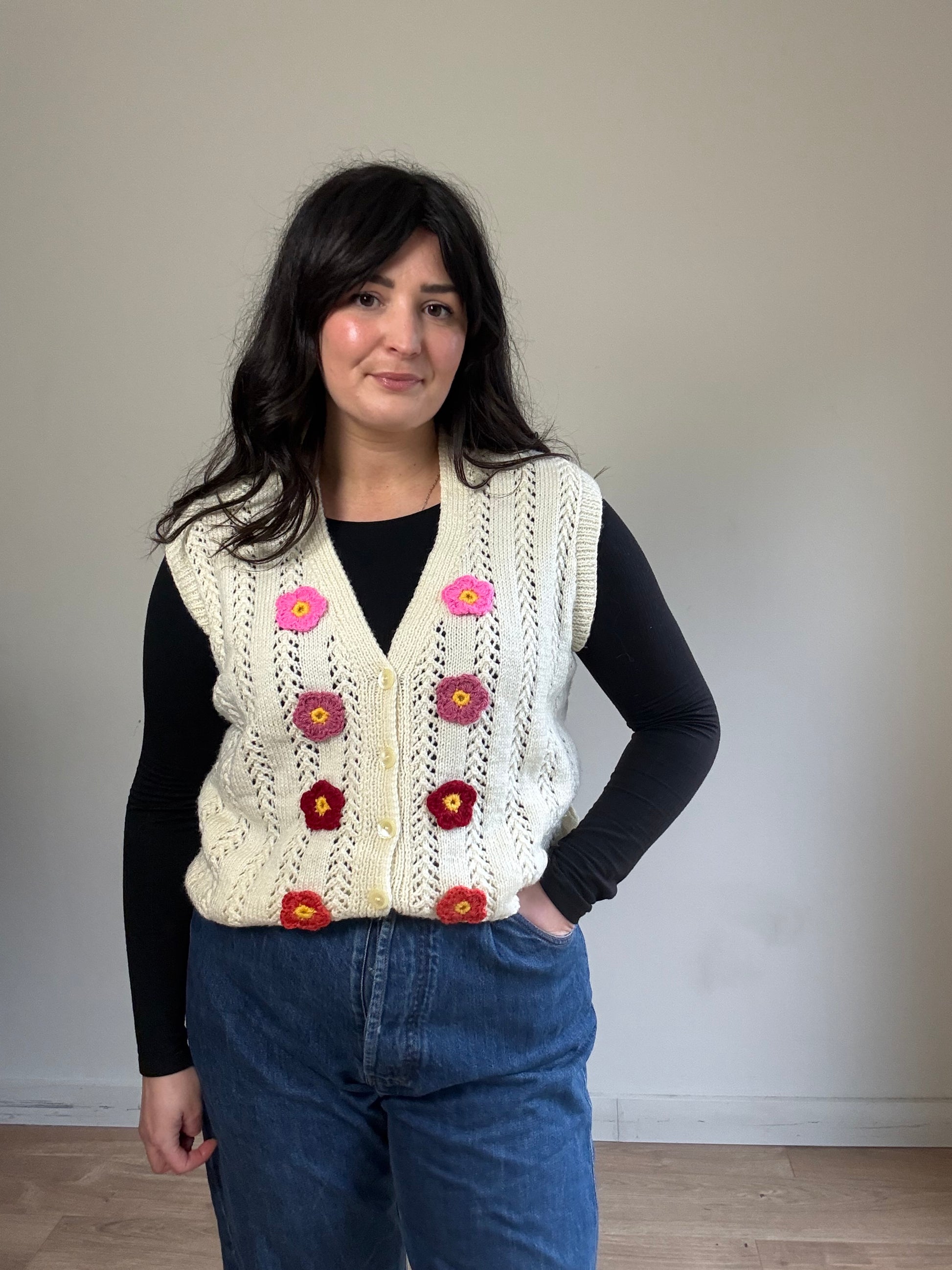 Hand-knit Crochet Flower Vest, L