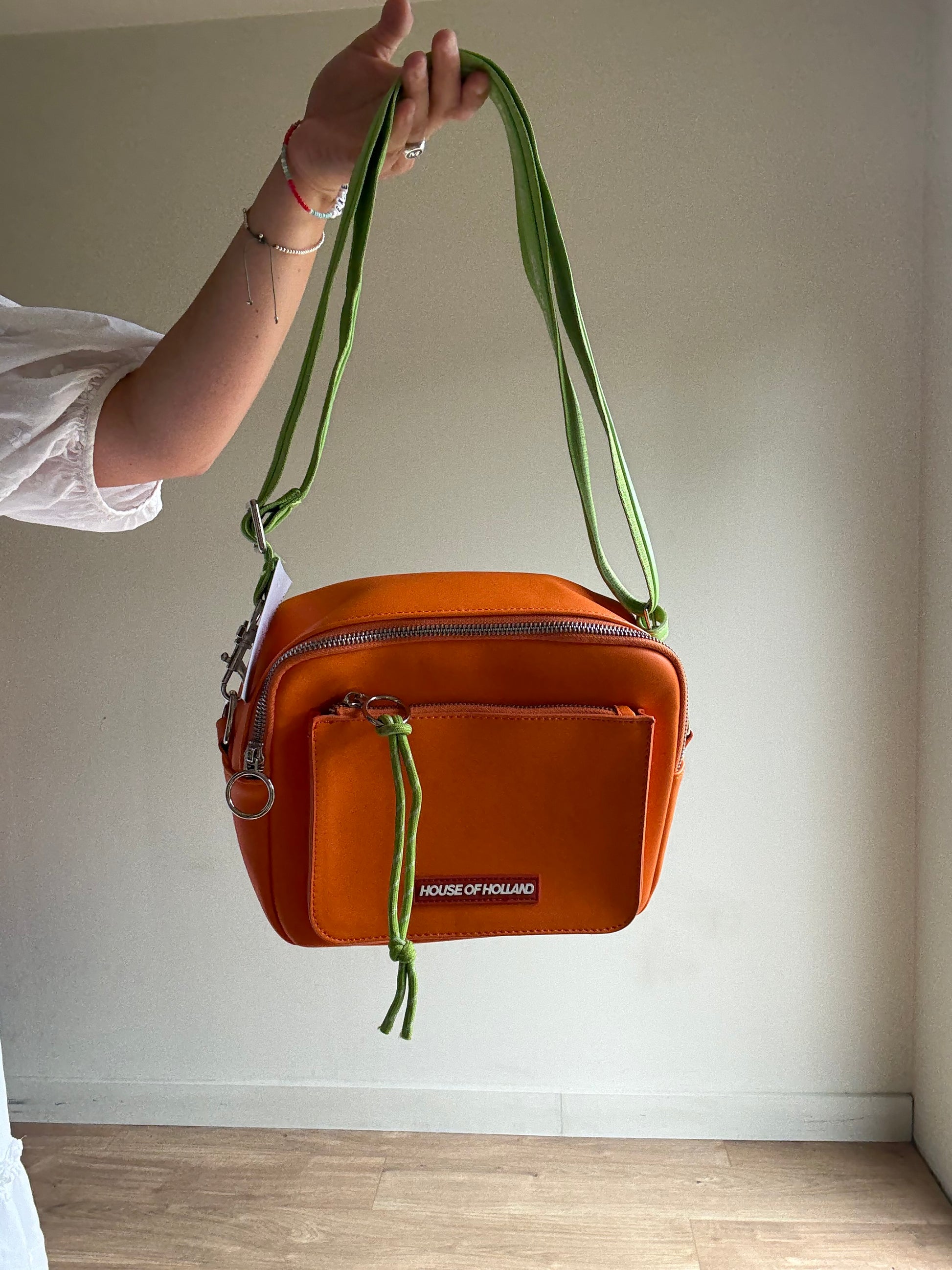Removable and adjustable crossbody strap with Nylon weave and House of Hollan branding.
