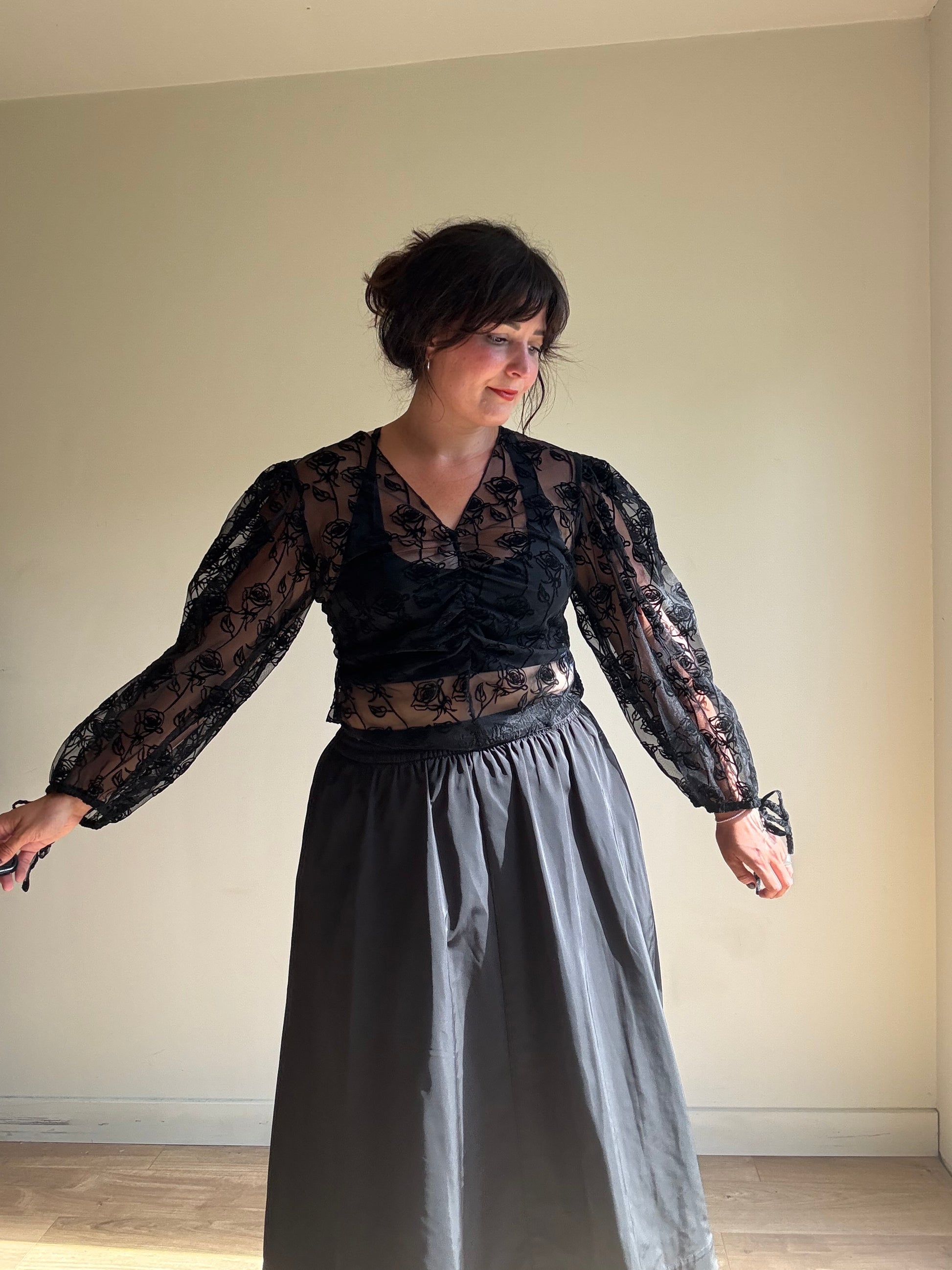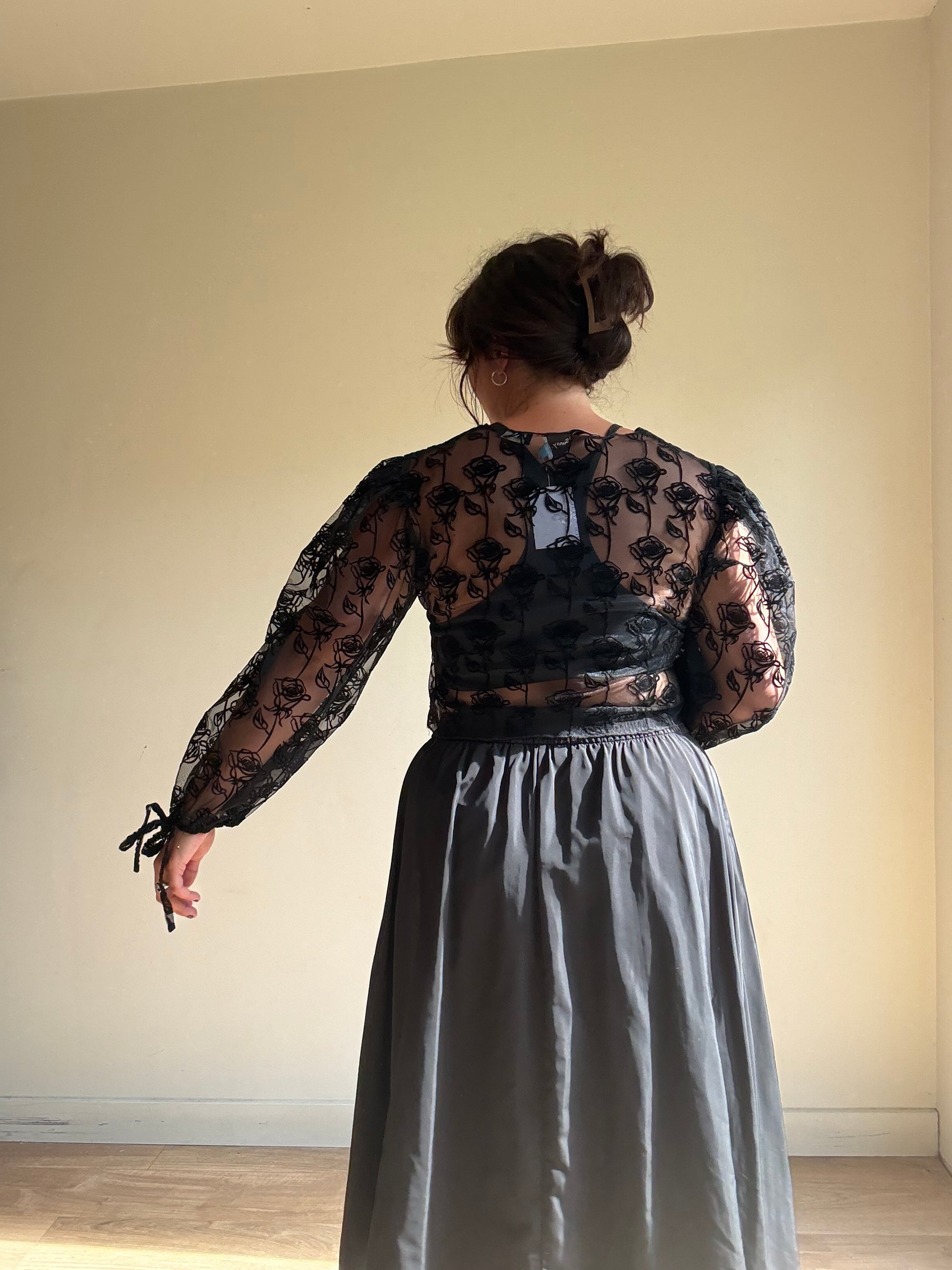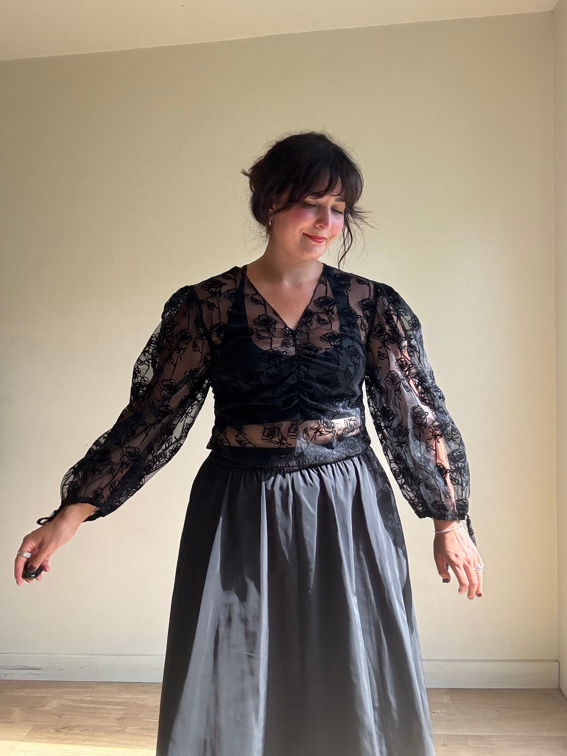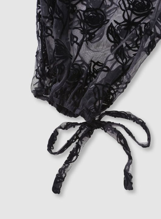 Made in a luxurious nylon craft, the blouse shows off a gorgeous black rose pattern while accented with stunning flocked detailing.
