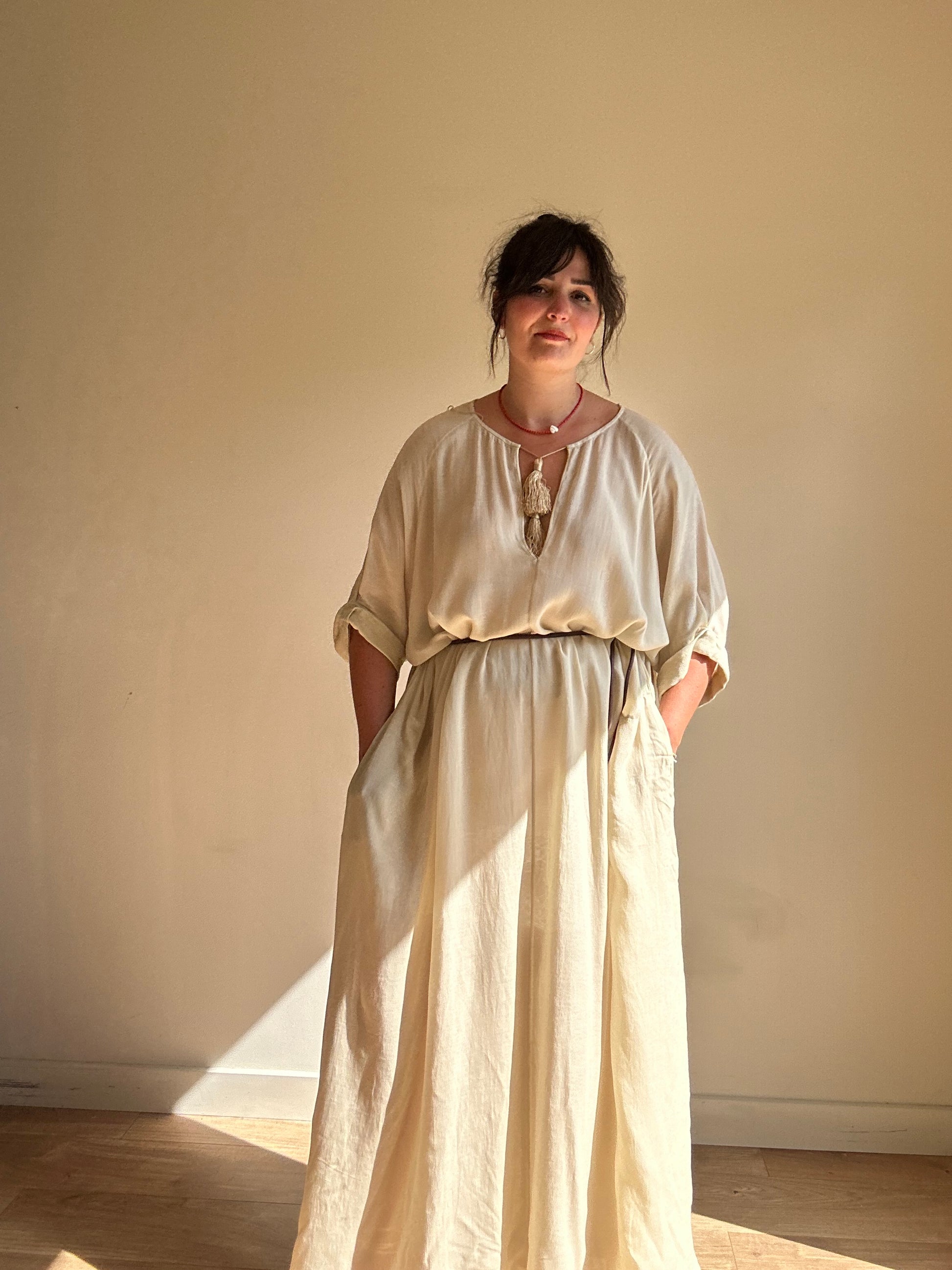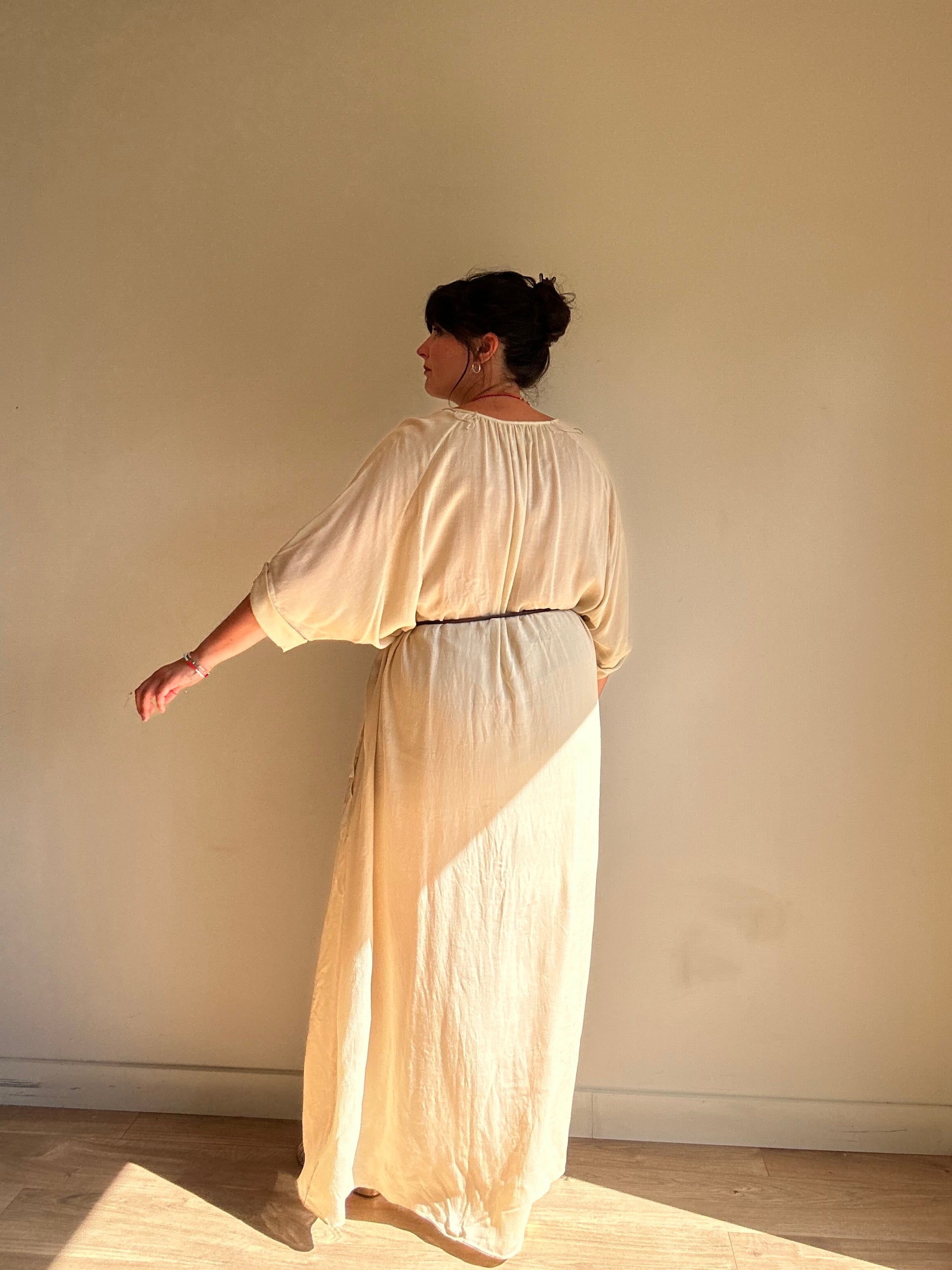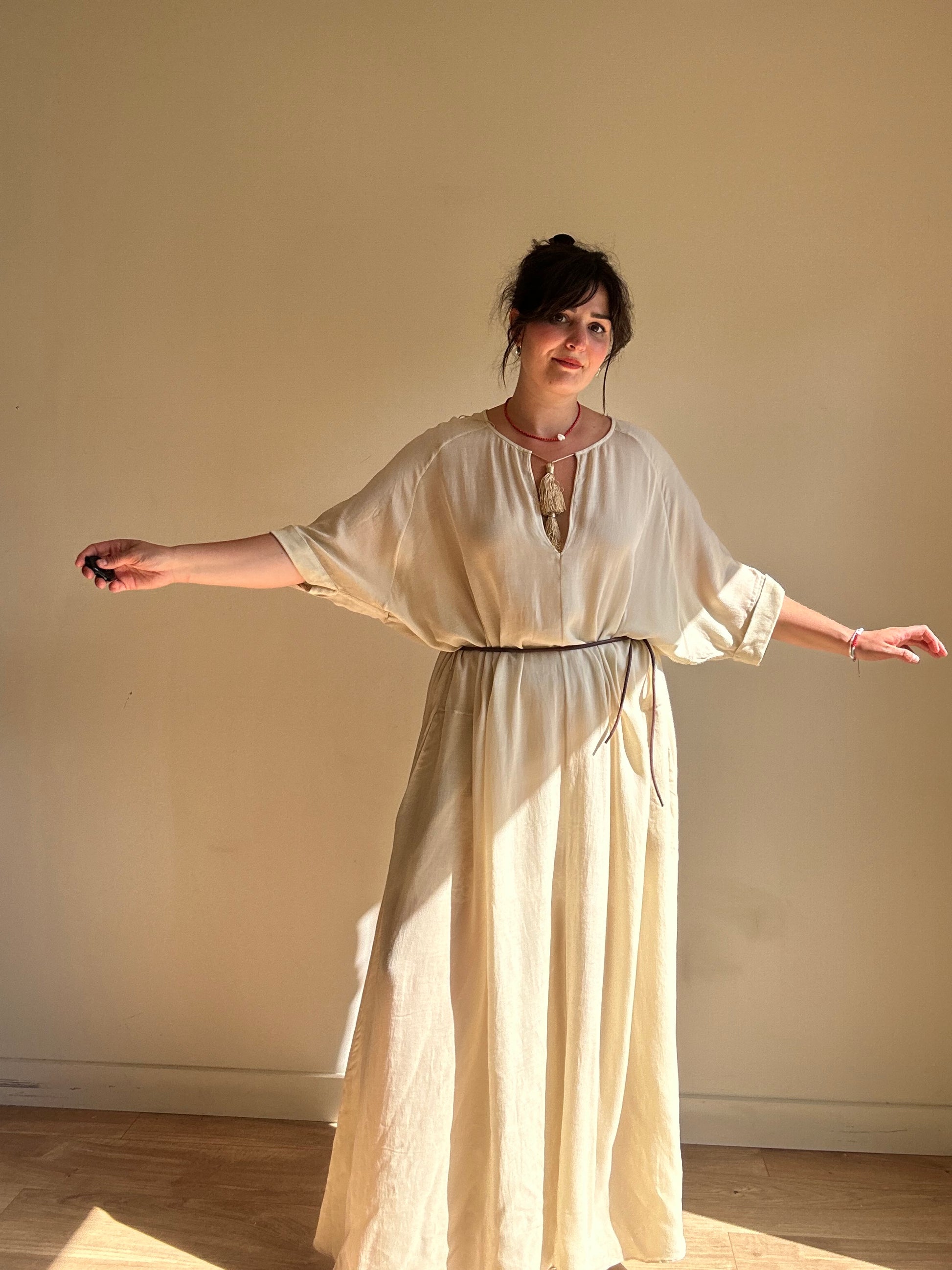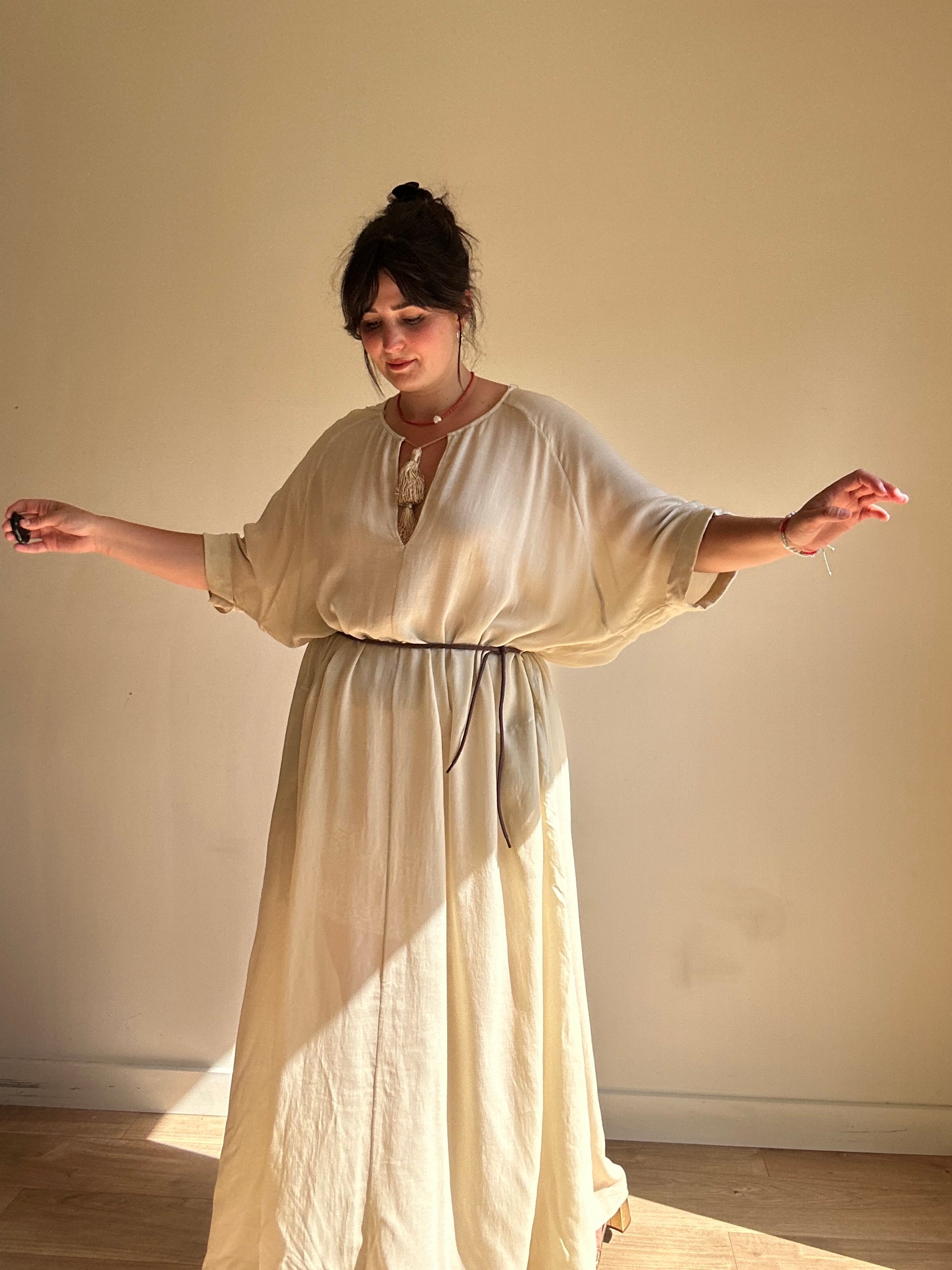 Little belt loops on the side, but no belt included. I’ve used a nice brown rope which works well.