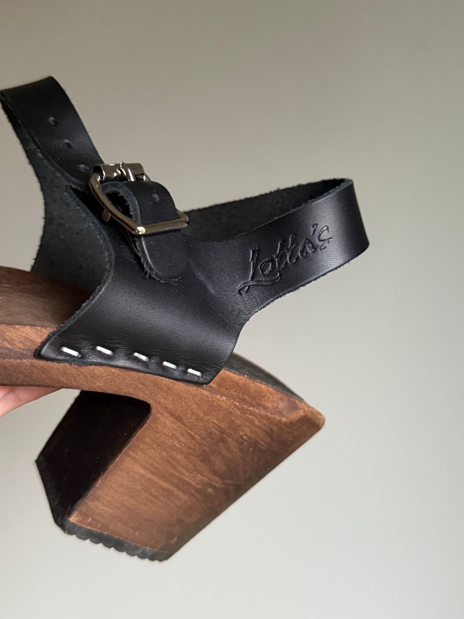 Wooden brown base with black leather heel strap and buckle.