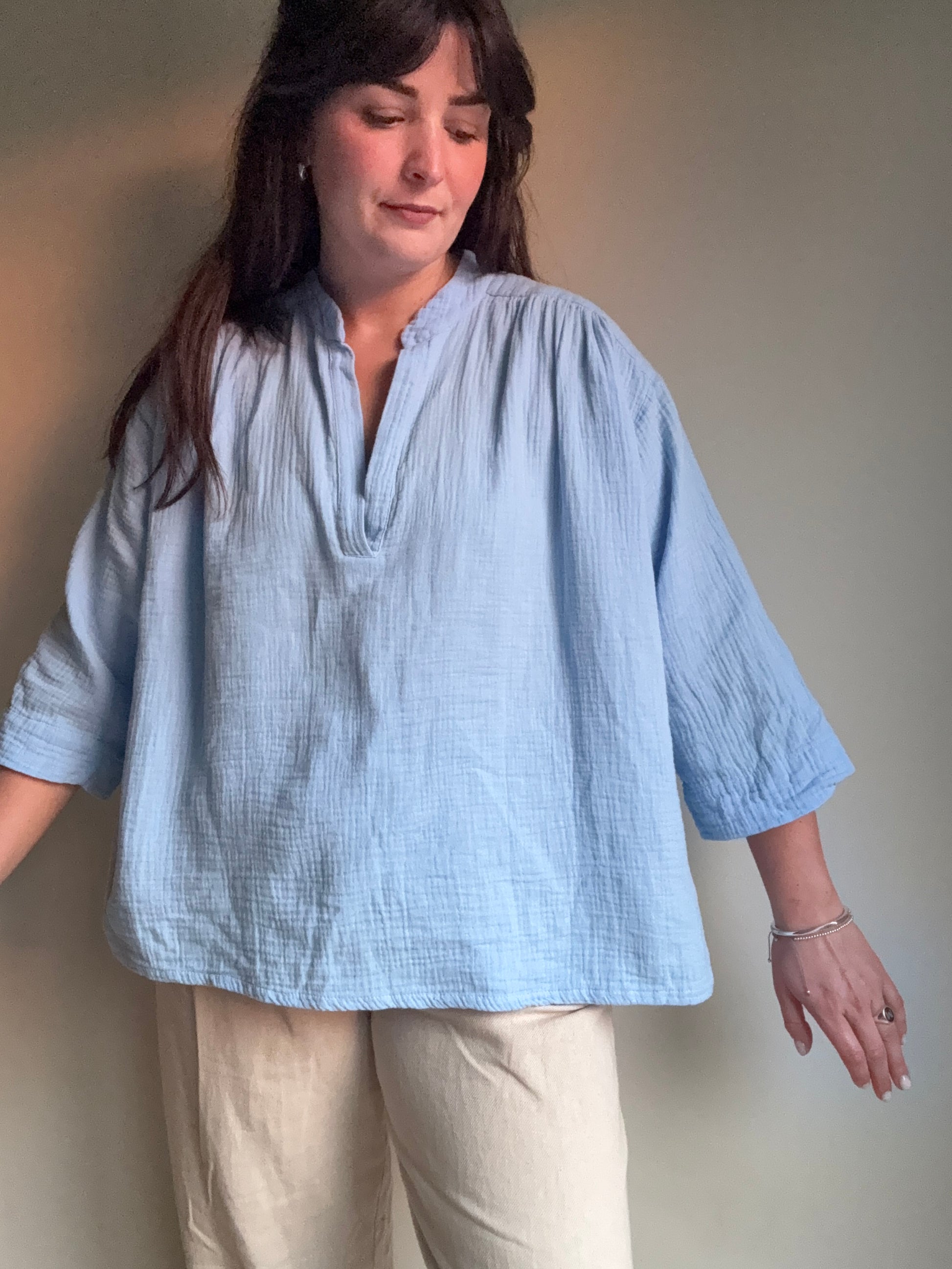 V neckline with gathered shoulders, small splits in the side of the hem.