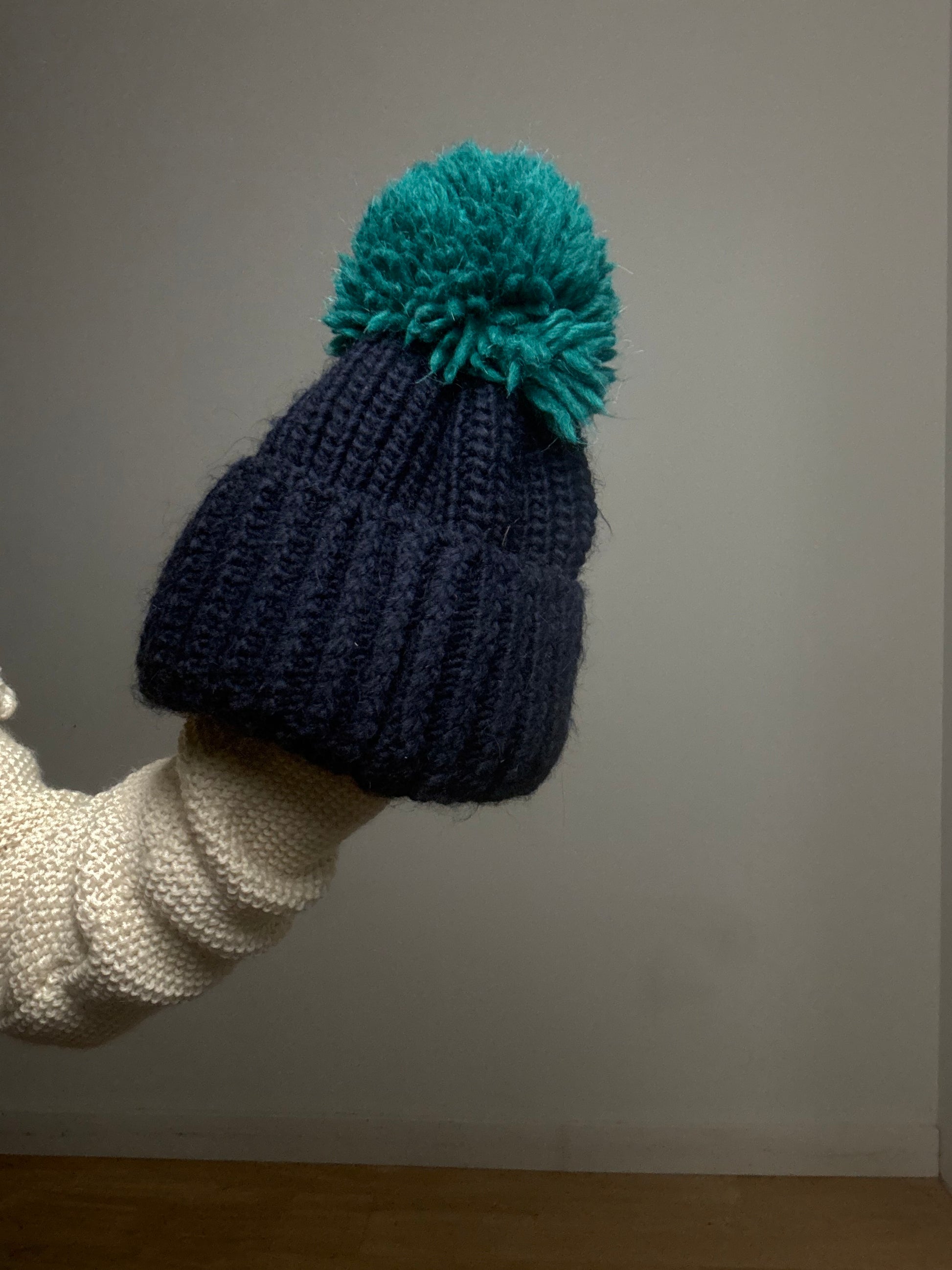 Navy beanie with an amazing giant fluffy bobble on top in a deep green.